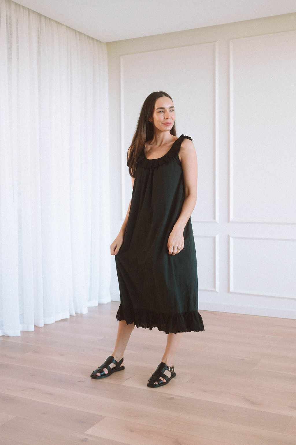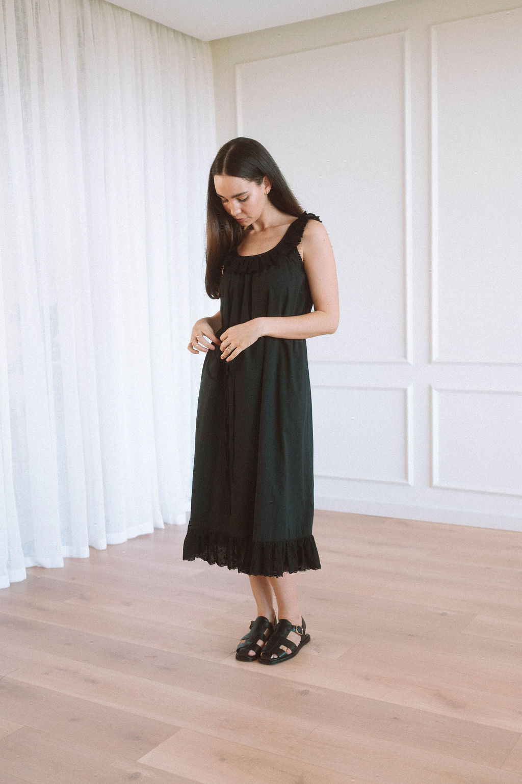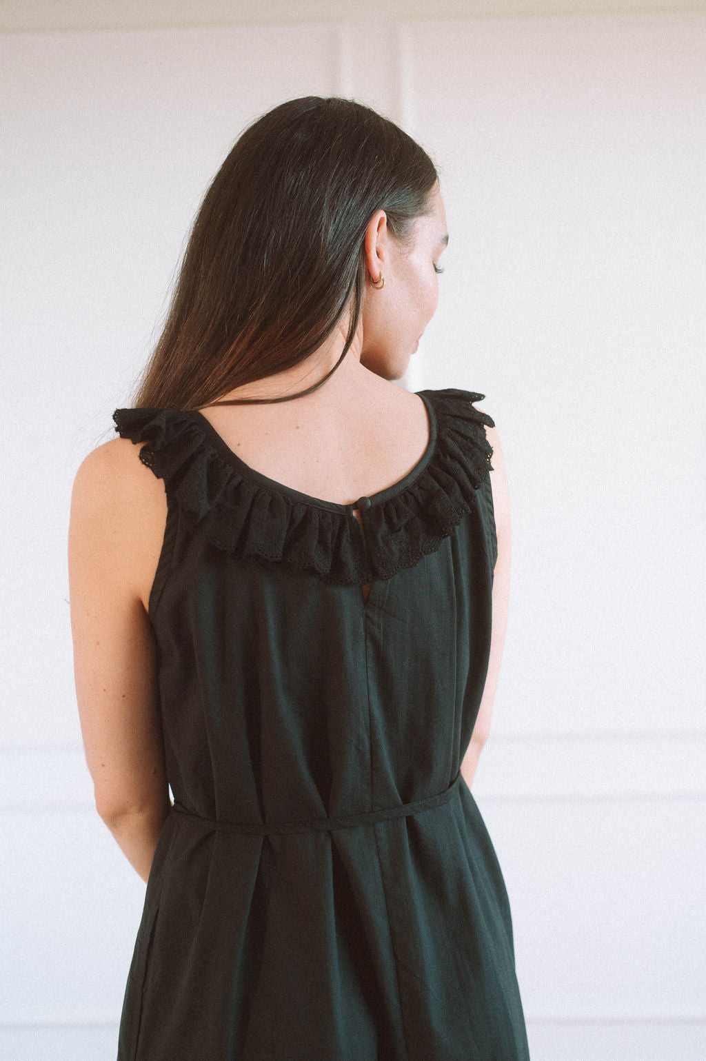 Our Ruby dress is available in very limited quantities, in 2 colours; black and white. Both an excellent quality, ultra soft 100% cotton, with 100% cotton lace ruffles.