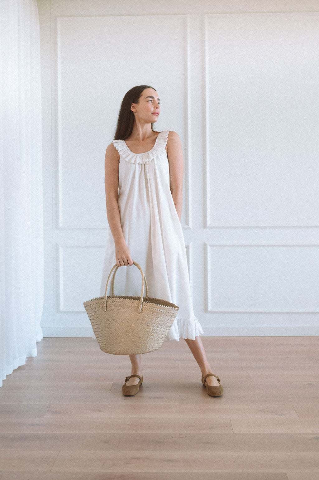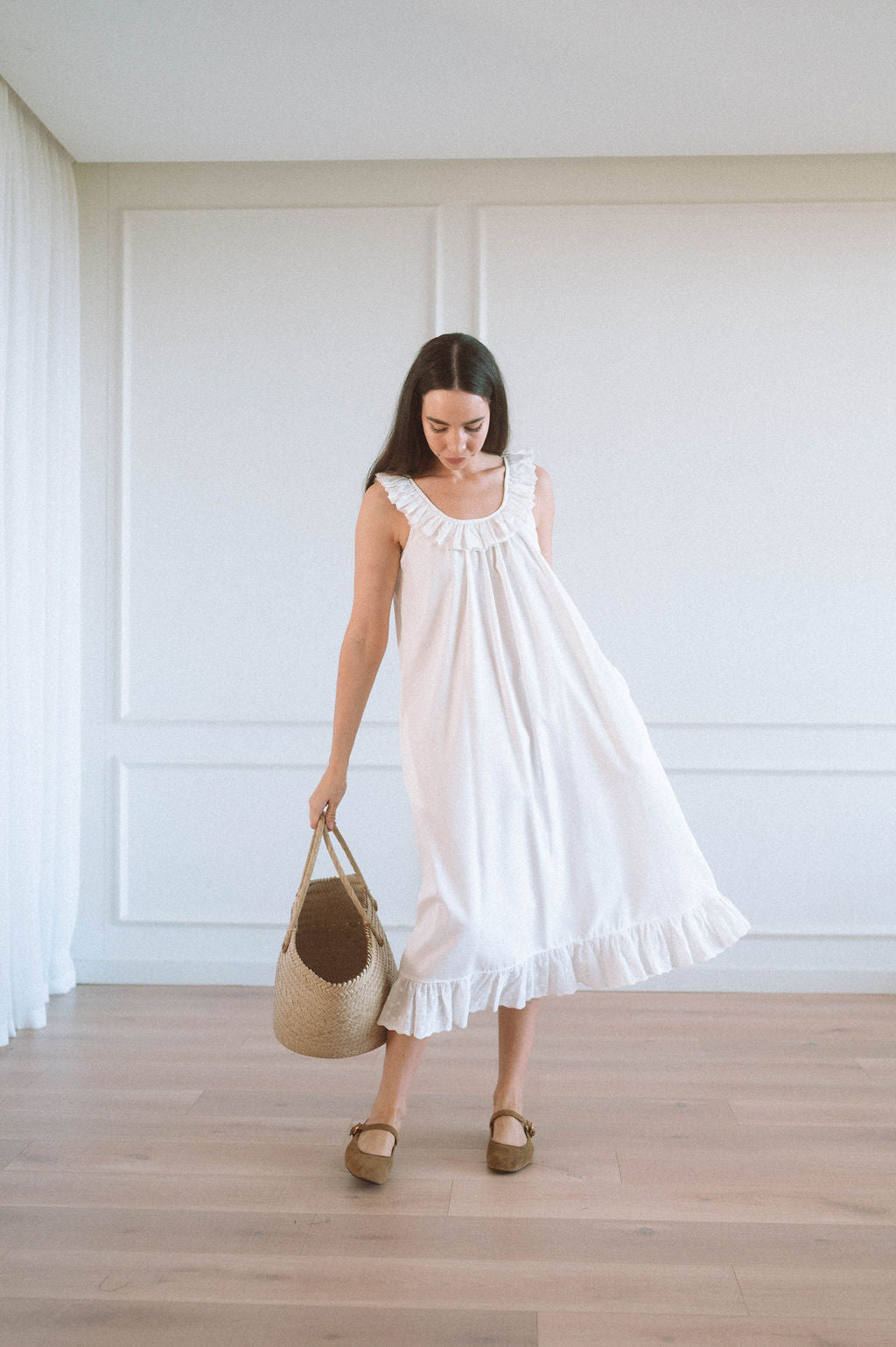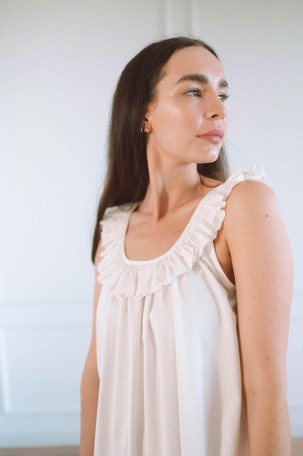 Ruby is a one of a kind tent style dress with unique 100% cotton lace ruffles around the neckline and at the hem of the dress. Can be worn loose without or with the binding tie in the waist.