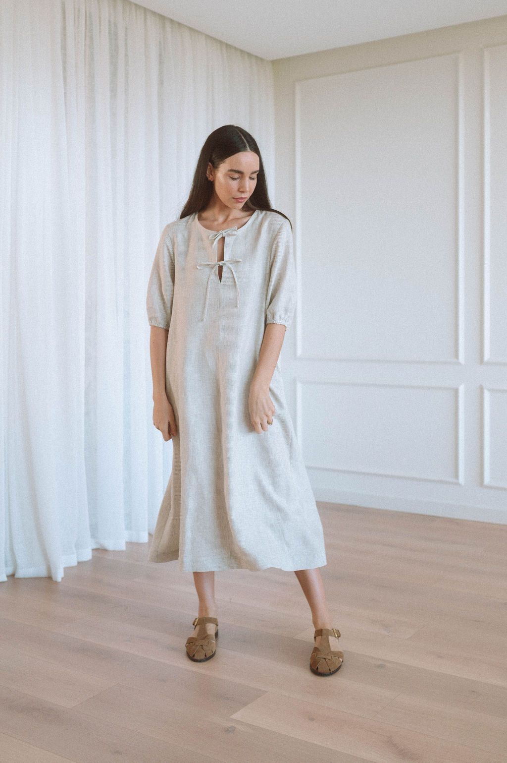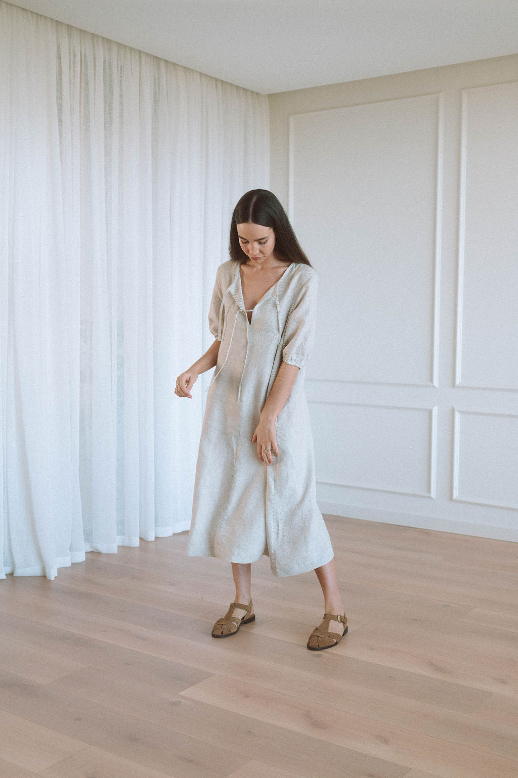 Your new favourite dress, another trans-seasonal staple you will be wearing year in and year out. A relaxed silhouette with 2 narrow binding ties at the neckline, an easy to wear throw on and go. The sleeves gather gently into a soft elastic cuff at the hem.