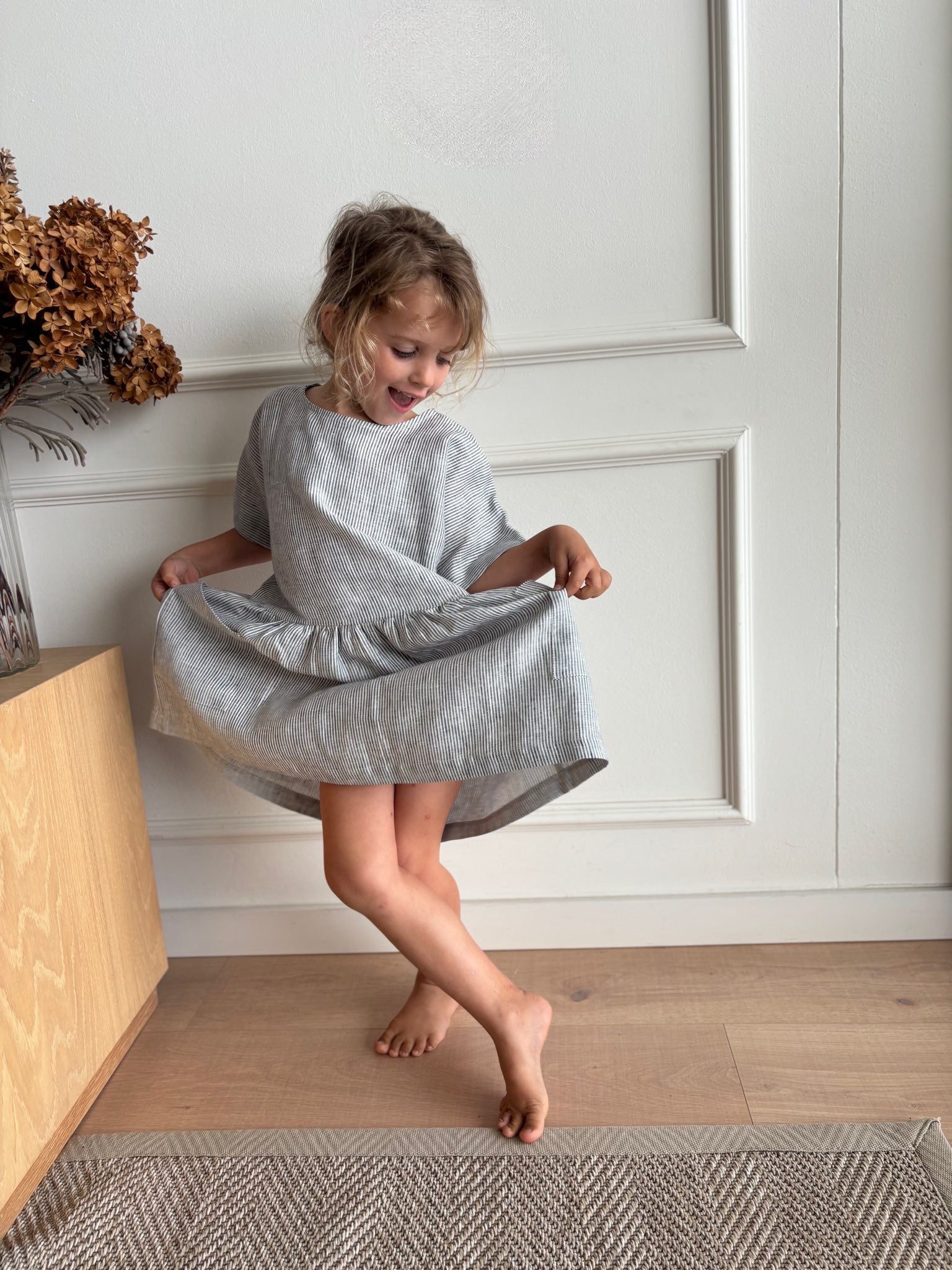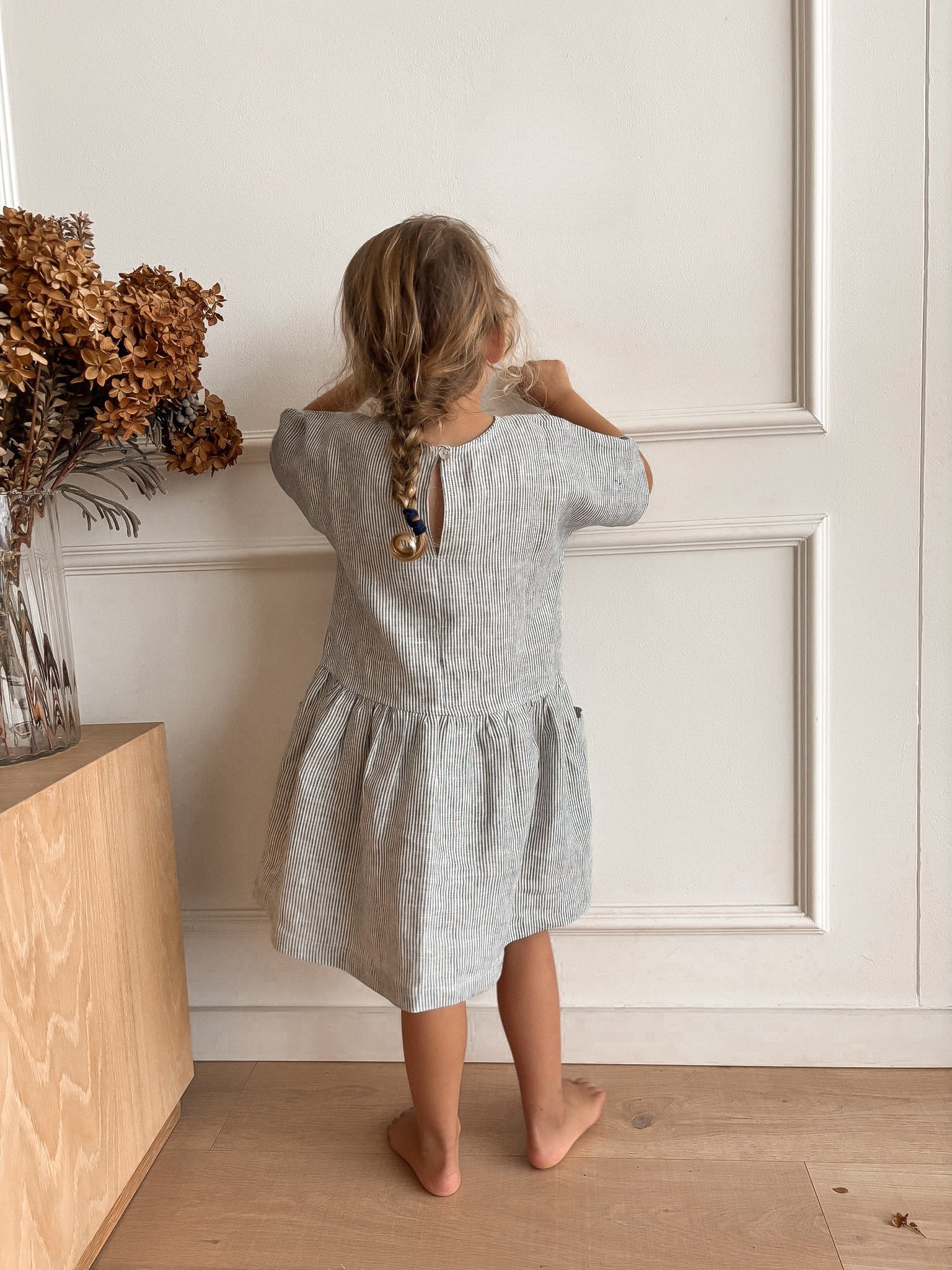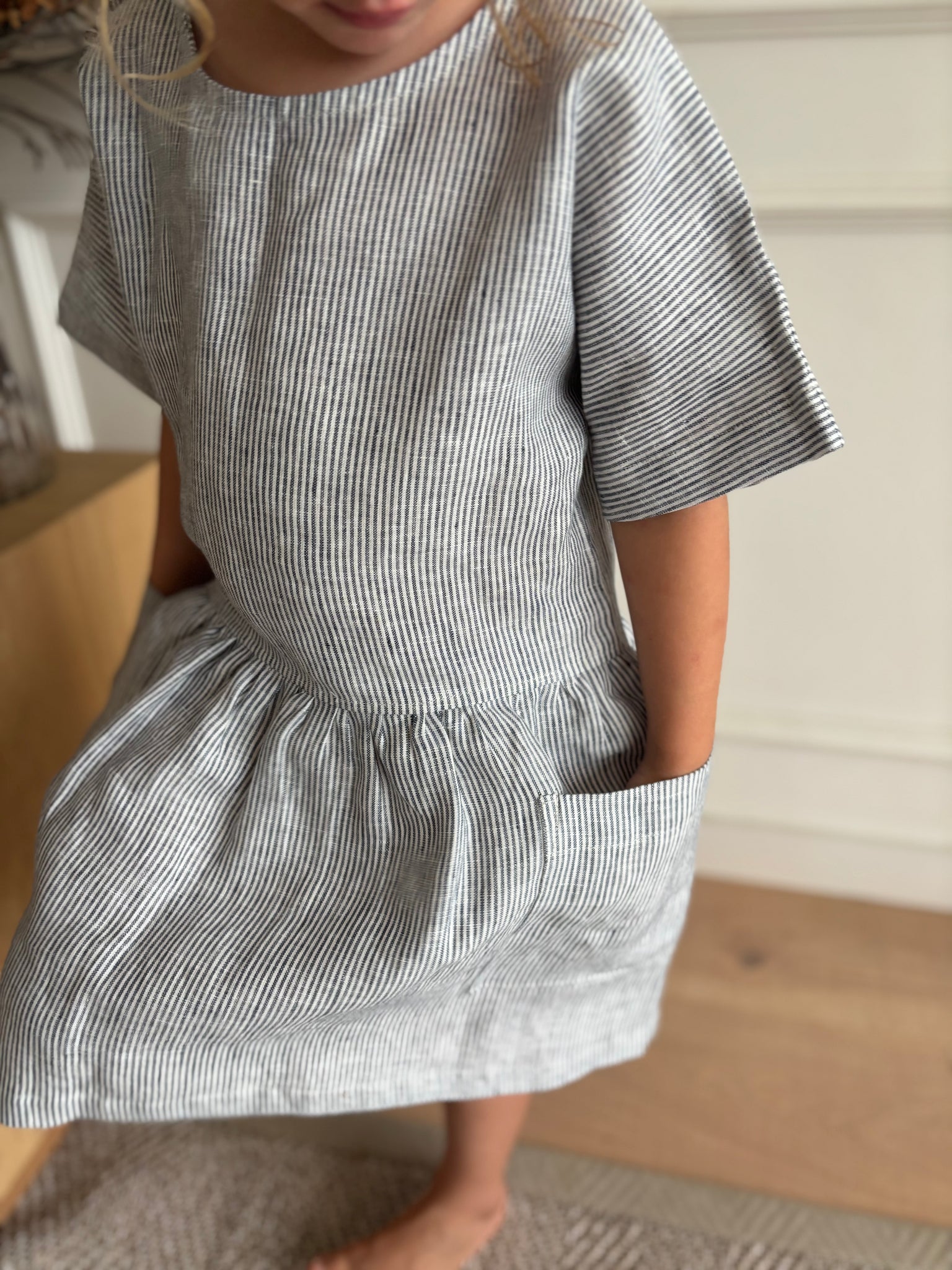 A loose, boxy fit girls dress with a drop waist and grown on sleeve. Patch pockets ideal for collecting treasures.