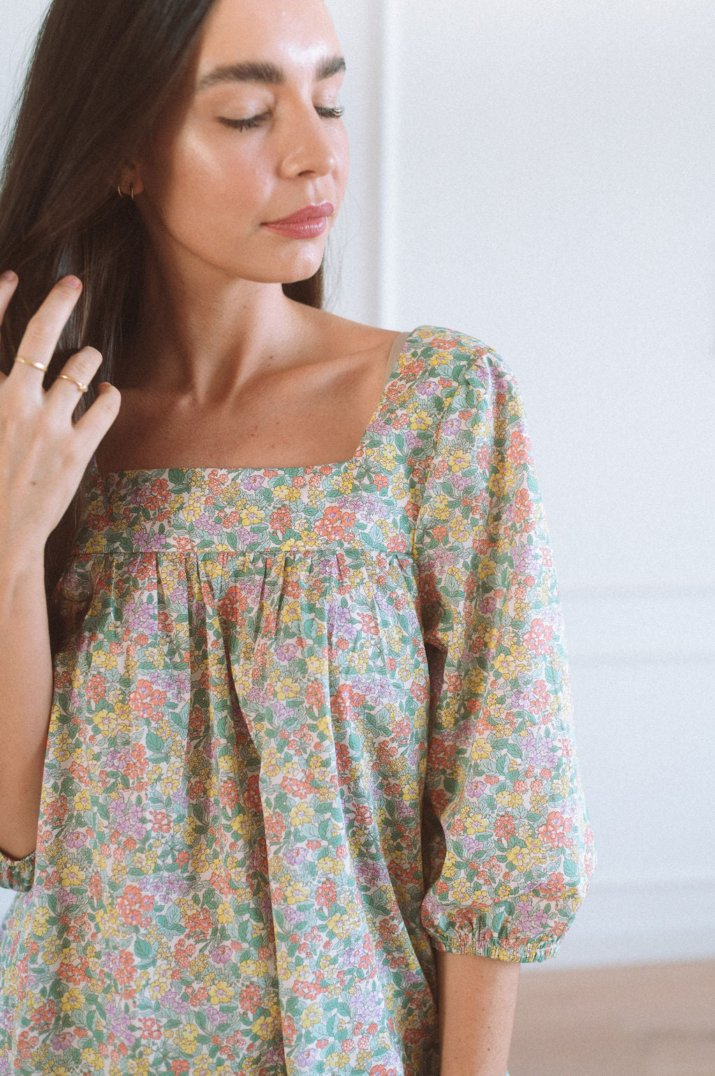 Our Josie dress, available for now in three new genuine Liberty printed fabrics. Based on the fit of our much loved Chloe dress with a square neckline, but now with an elbow length puff sleeve.