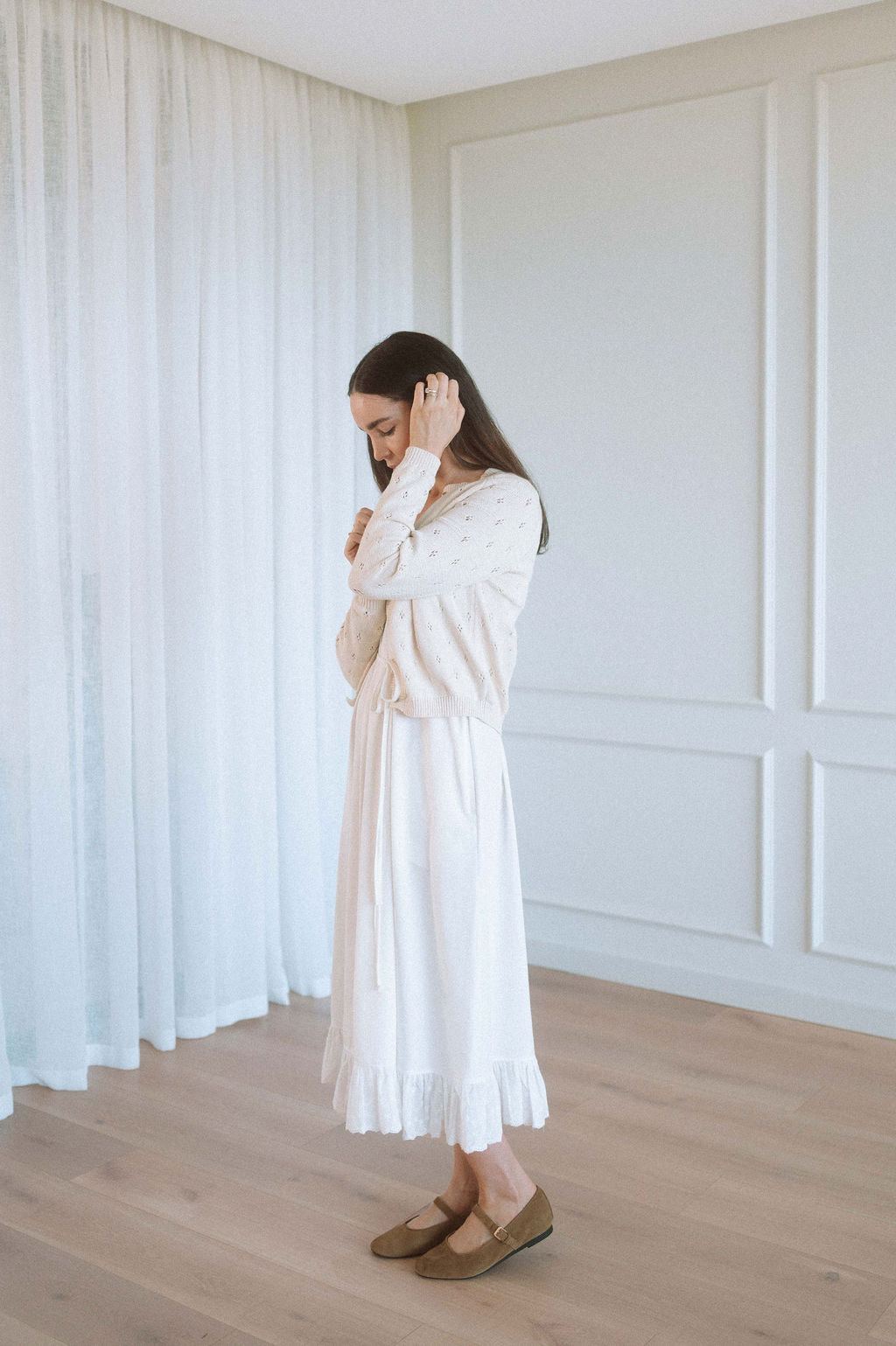 Lane is a slim fitting cardigan made using a linen/and or organic cotton yarn, constructed in a delicate looking eyelet lace design. The knit is lightweight and perfect for all seasons, layered in winter and over a dress come spring.