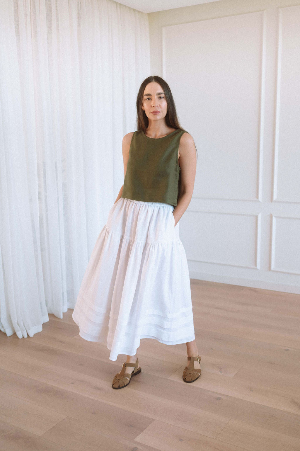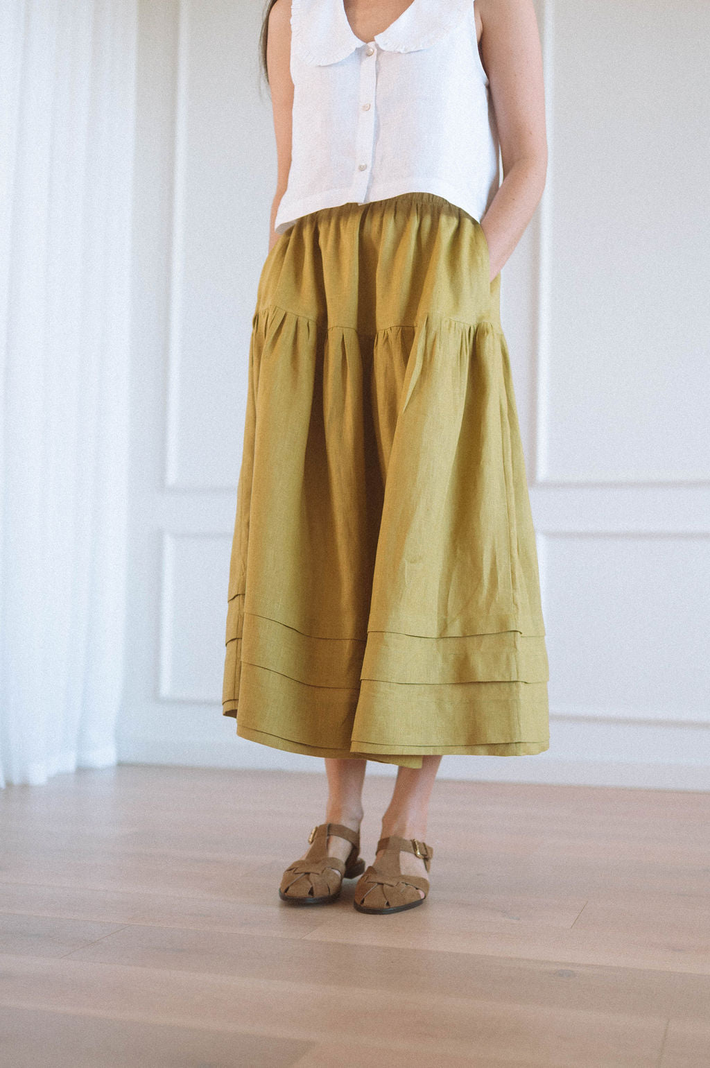 Our Maeve skirt is a tiered mid length skirt with gorgeous pintuck detailing at the hem.