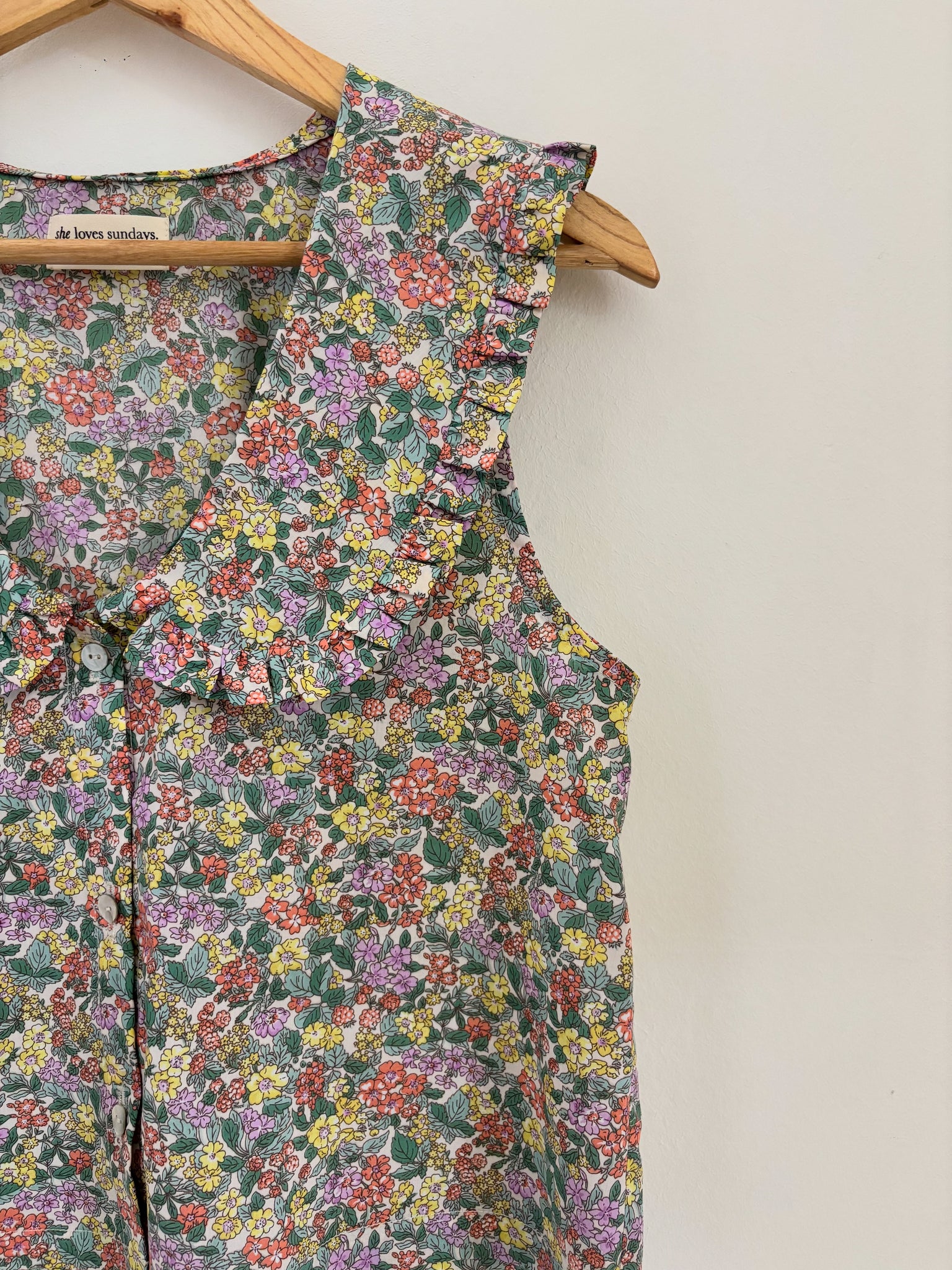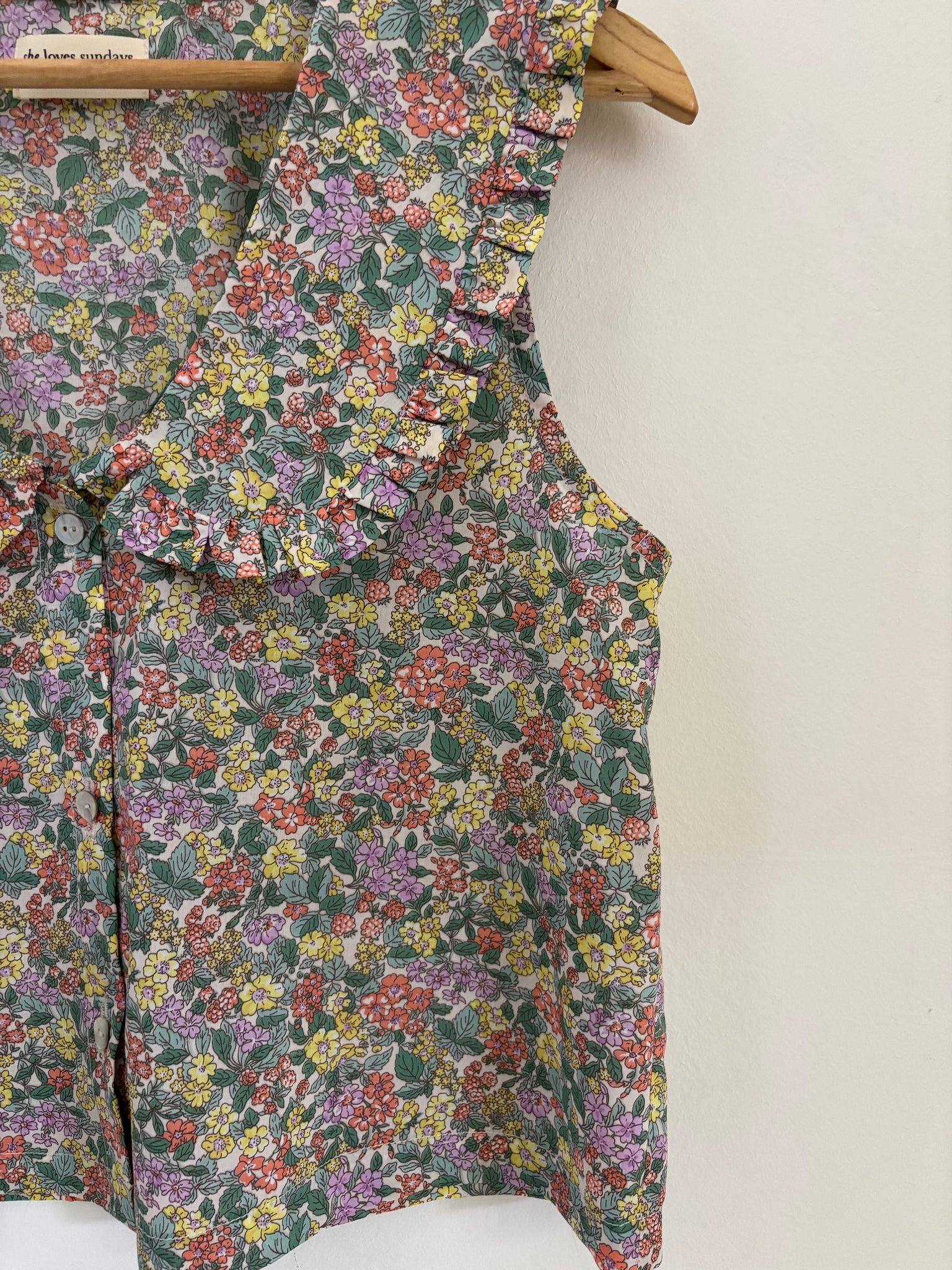 The sweetest, summery blouse. A V-shape neckline with a Peter Pan collar, finished with a ruffle edge. A boxy fit with 3 shell buttons down the centre front.